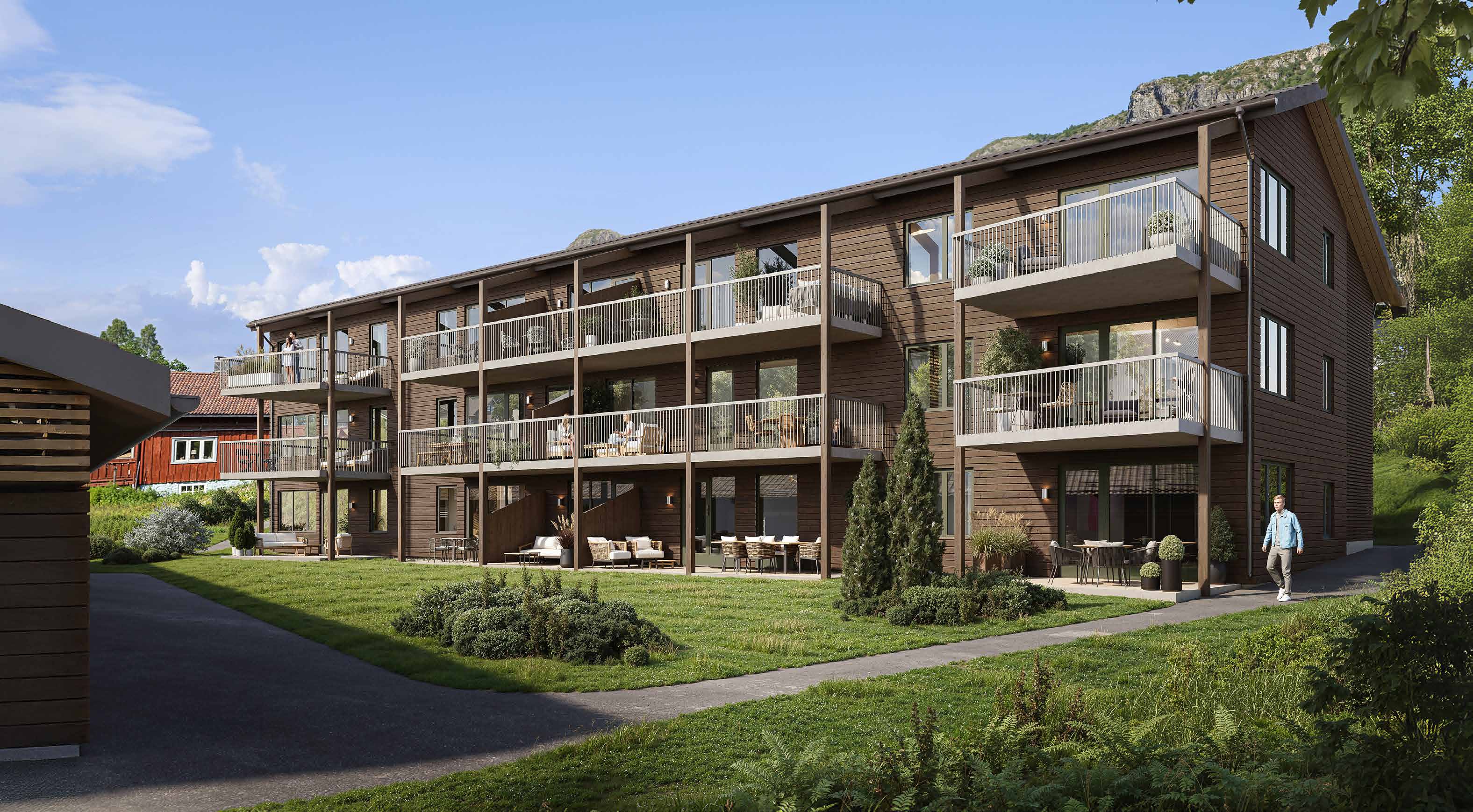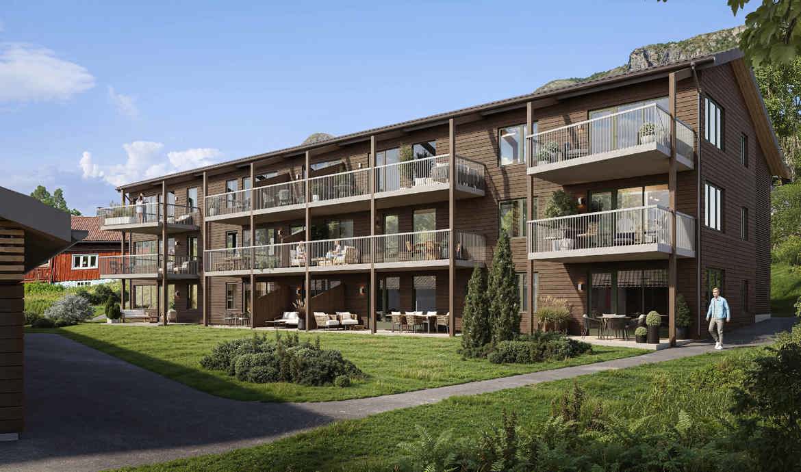Rundt lavblokken blir det avskjermede grøntarealer med beplantning og friområde.