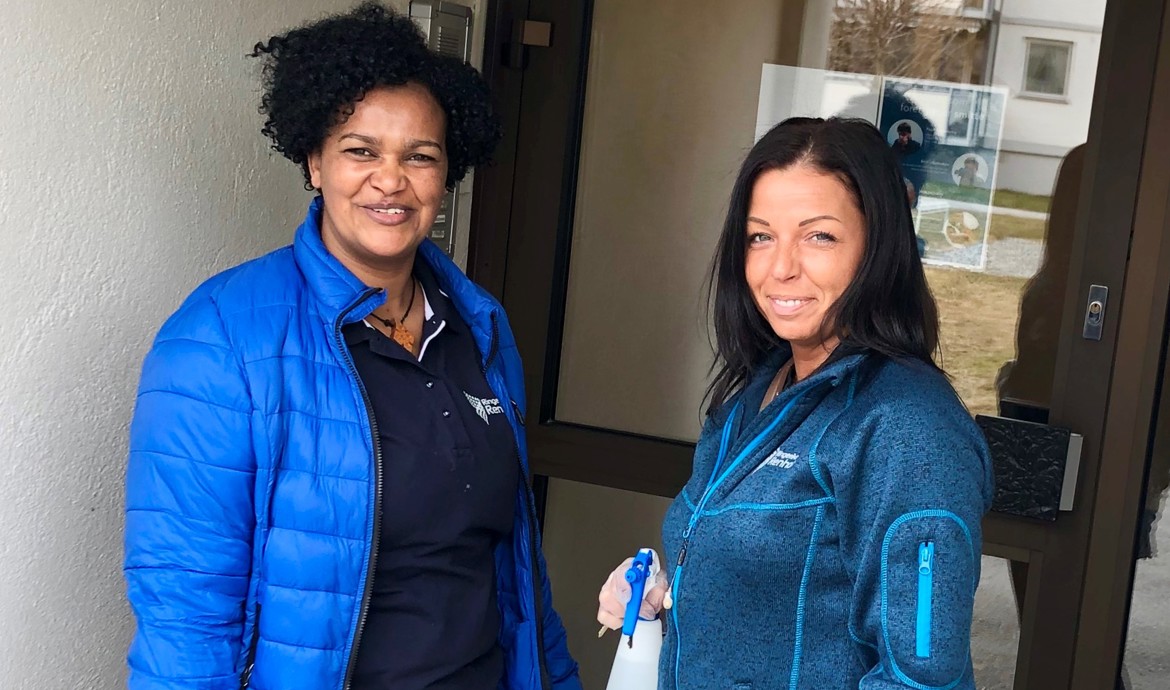 Bildet viser Jana og Shishay fra Ringerike Renhold på jobb i Nansenveien.