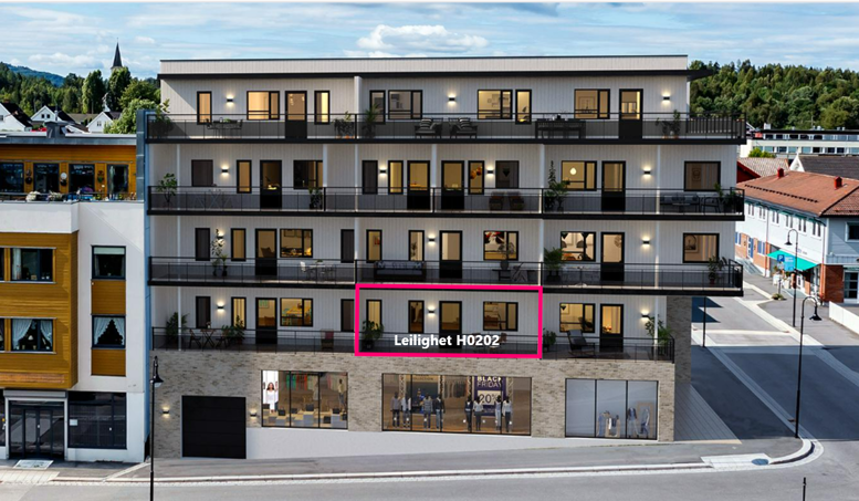 Leiligheten ligger i 2. etasje og har åpen stue- og kjøkkenløsning med integrerte hvitevarer, lys grå vegger og grå kjøkkeninnredning fra Nybo, ett soverom, flislagt bad, entré, bod/teknisk rom og stor balkong. Det følger med parkeringsplass i carport og sportsbod.