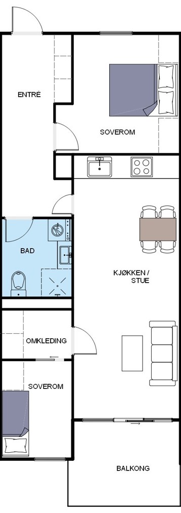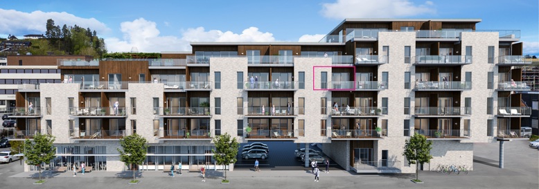 Leiligheten er på 68 kvm og ligger i 4. etasje i blokken. Den har åpen stue- og kjøkkenløsning med lysgrå vegger og grått kjøkken fra Nybo med integrerte hvitevarer. Leiligheten består ellers av entré, flislagt bad med varmekabler, to soverom hvorav et har tilknyttet omkledningsrom/bod, og balkong. Det følger med egen bod og parkeringsplass i garasjekjeller.