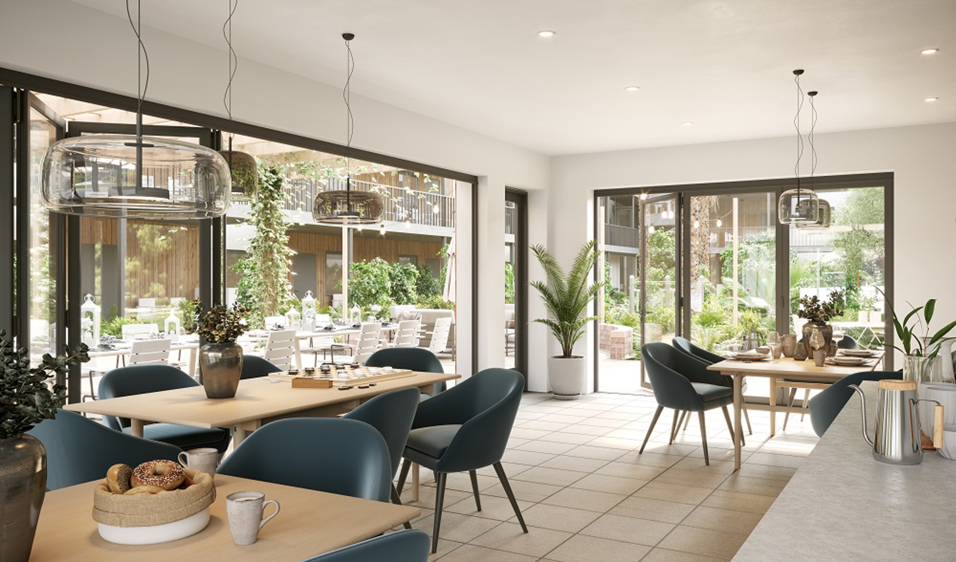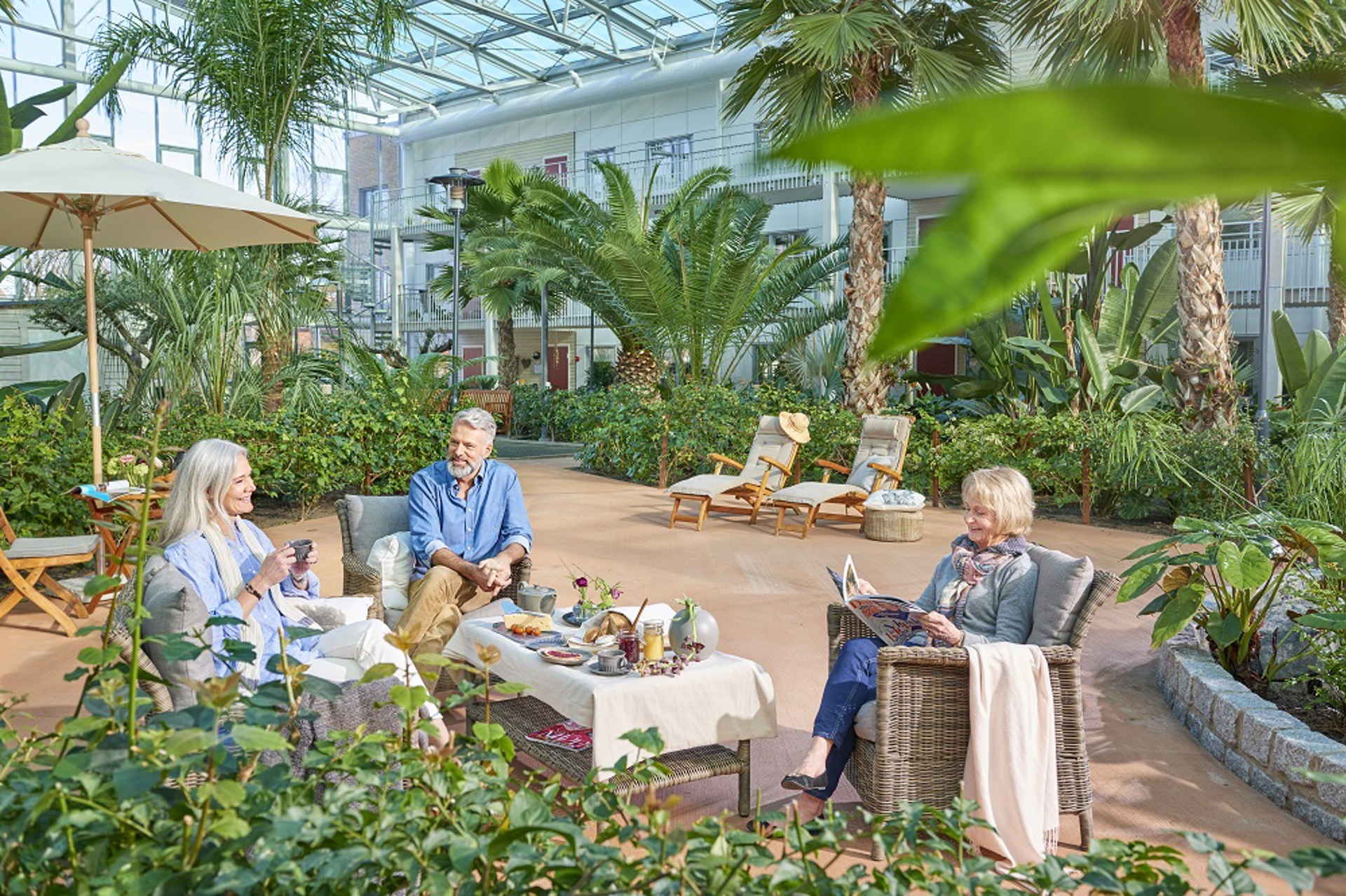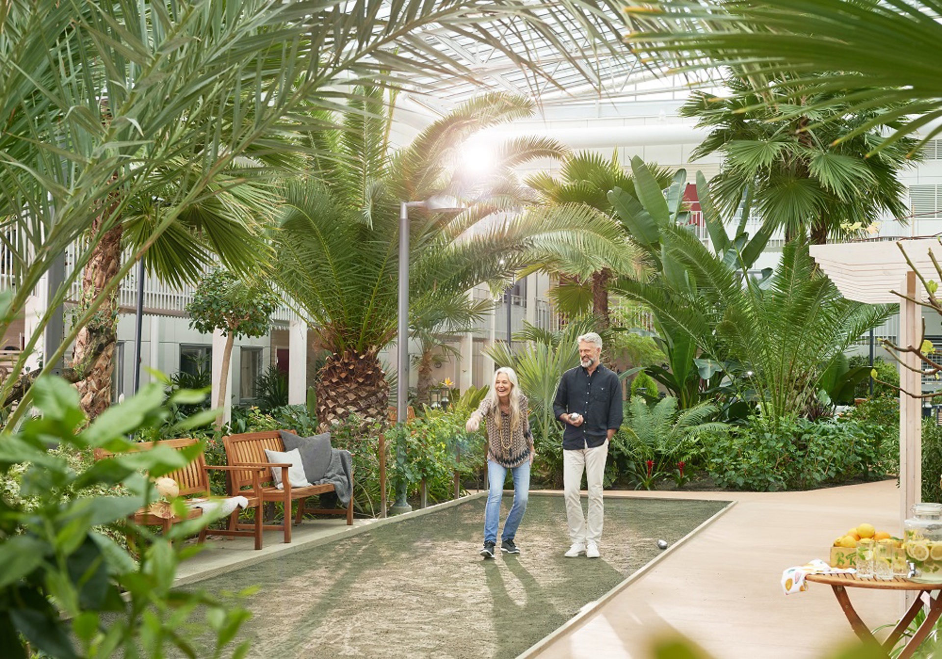 I vinterhagen er det forskjellige sittegrupper, solsenger og egen boccia-bane, alt tilrettelagt for en sosial og aktiv hverdag hele året. Anlegget har i tillegg eget treningsrom med utstyr, badstue og selskapslokale med felleskjøkken. Får du gjester, kan du leie en leilighet til besøket ditt inne i bygget.